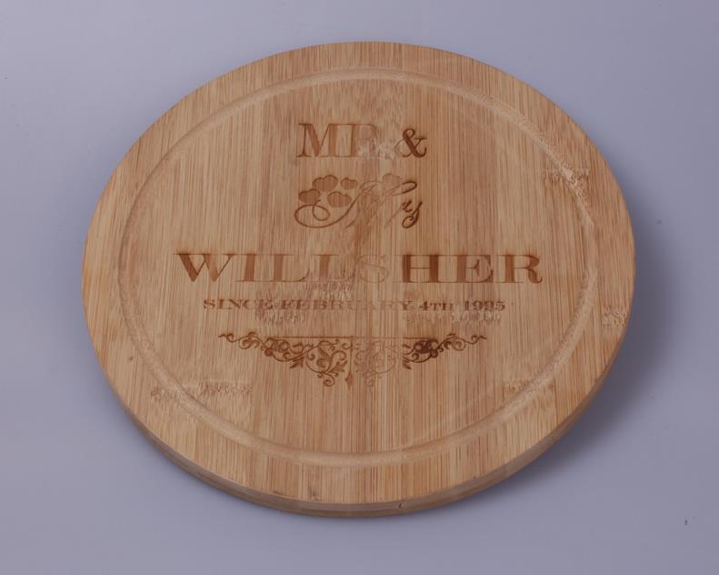 August 17 2016This beautiful round bamboo cheese board will make a delightful display with a spread of cheeses on it. The cheese board is laser engraved with a words, names, dates or images . This will make a a great wedding gift. Any names or words can be added making this the ideal gift for any occasion. 25cm. Contact us to design a unique cheese board.